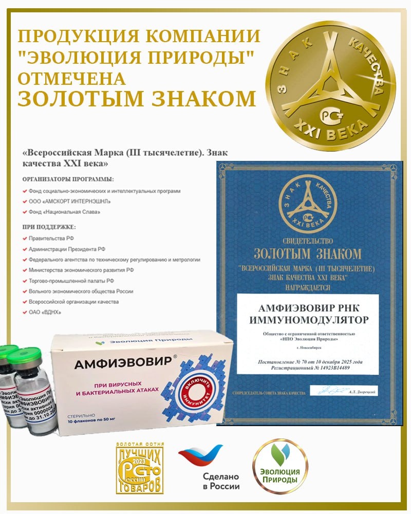 Очередная победа в этом году у компании "Эволюция Природы", которая специализируется на разработке и производстве продукции для здоровья на основе природных компонентов. На конкурсе «Всероссийская Марка (III тысячелетие) Знак качества XXI века» иммуномодулятор "Амфиэвовир" отмечен ЗОЛОТЫМ ЗНАКОМ качества!!! Конкурс «Всероссийская Марка (III тысячелетие) Знак качества XXI века» является системой добровольной сертификации продукции (услуг) по категории КАЧЕСТВО. «Всероссийская марка» информирует потребителя о том, что маркированная этим знаком продукция (услуга) не только безопасна, но и качественна. Являясь привлекательным для потребителя, Знак качества становится привлекательным и для производителя, стимулируя увеличение сбыта продукции (услуг). Конкурс "Всероссийская Марка (III тысячелетие). Знак качества XXI века" - долгосрочный проект, направленный на продвижение качественных товаров, услуг и передовых технологий на российский рынок, решение задач импортозамещения. Программа действ