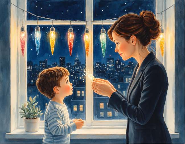 В комнате снова было тихо, только мигала гирлянда, отбрасывая на стены пляшущие разноцветные тени. Ваня, успокоенный разговором с бабушкой, уже возился с машинками. А Таня стояла у окна, глядя на тёмный город.