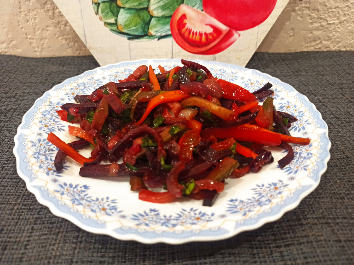 Этот салат станет настоящим украшением вашего стола благодаря ярким цветам ингредиентов и насыщенному вкусу. Простота приготовления позволяет насладиться свежестью овощей даже начинающим кулинарам. Салат отлично подойдёт как самостоятельное блюдо или дополнение к основному меню, добавив ярких красок и витаминов вашему рациону. Что нам потребуется: ИНГРЕДИЕНТЫ: 🧅1 средняя красная луковица 🔹1 большая свекла 🫑1 болгарский перец 🥕1 средняя морковь 🥒2 маринованных огурца 🔹200 г вареной или консервированной красной фасоли 🧄2 зубчика чеснока (измельчить) 🔹1 ч. л. порошка кориандра 🔹3 ст. л. растительного масла (для приготовления) 🌱6 ст. л. рубленой кинзы 🌱3 ст. л. рубленой петрушки 🧂1/2 ч.л. соли ЗАПРАВКА: 💛4 ст. л. оливкового масла 💛1 ст. л. яблочного уксуса 💛Щепотка соли 💛Щепотка черного перца 💛 Соевый соус 2 ст. ложки Способ приготовления: Подготовка и нарезка овощей Перец, маринованные огурцы, морковь и свеклу необходимо нарезать соломкой. Лук полукольцами. 1. В сков