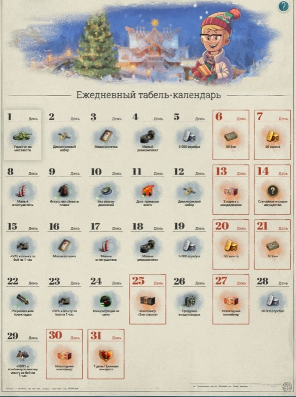 Добрый день, сегодня мы обсудим тему, связанную с табель календарём. На первый взгляд всё не так уж плохо, как обычно 100 золота, 100 бон, контейнер пут воина (куда без него) и прочие плюшки срезервами. Единственное что радует, это 2 новогодних коробки и 3 ящика с мандаринами. Но они выпадают только на последних днях. Все поняли что это значит? Этим способом разработки пытаются внушить игрокам каждый день входить в игру, а если вошёл, то почему бы не поиграть? В этом то и весь смысл. На 14 дне нас встречает случайное игровое имущество, многие задаются вопросом, что из него выпадает. В основном из нужного падает только премиум аккаунт (что в большинстве случаев), поэтому считать его нужным или нет, это каждый решает сам. Итоги: В целом календарь интересный. Но чтобы из него получить коробки, нужно будет входить каждый день. Как обычно там 100 золота, 100 бон и контейнер путь воина, единственное что изменилось, это добавили 2 новогодние коробки и 3 ящика с мандаринами. А что думае