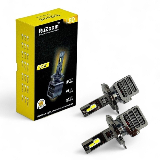 RuZoom H4 DG001 — светодиодные лампы головного света для автомобилей с цоколем H4. Предназначены для установки в фары ближнего и дальнего света. Комплект включает 2 лампы и инструкцию.