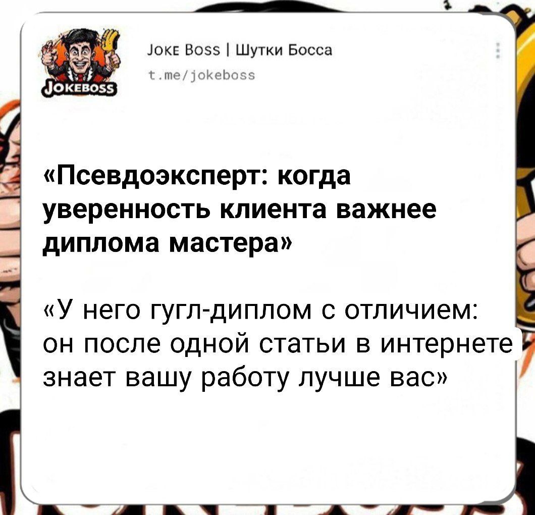 Современный «технический эксперт» не нуждается в образовании — ему достаточно заголовка статьи и уверенного взгляда. Его главный инструмент — не отвёртка, а непоколебимая вера в то, что 5 минут в интернете заменяют 5 лет обучения. И самое страшное, что иногда он даже прав — ведь платить потом будет вам. #Псевдоэксперт #ПсевдоэкспертНаЛинии #УверенностьВажнееЗнаний #google #КлиентЗнаетЛучше #декабрь #новыйгод #юмор #шутки #joke #jokeboss #шуткибосса