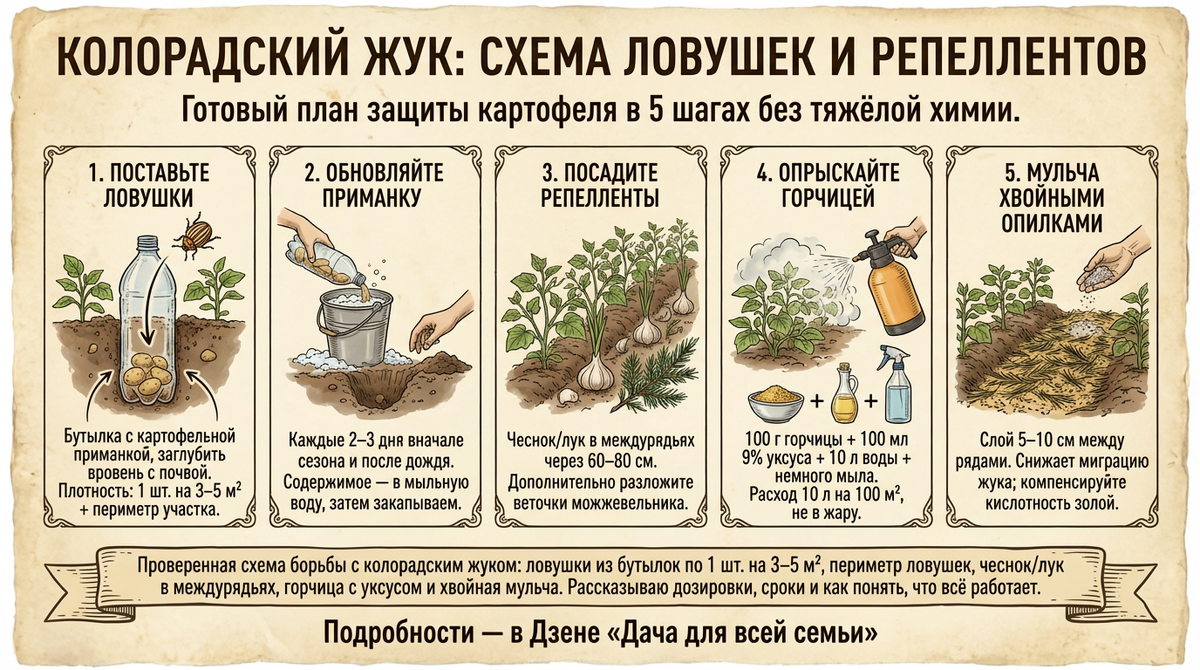По нашим сезонам и по открытым публикациям устойчиво подтверждается работа бутылочных и баночных ловушек с картофельной приманкой, особенно весной и осенью, и сдерживающий эффект горчицы и чеснока. Можжевельник и хвойные опилки показывают себя как полезные помощники, но без «чудес» — это часть общей схемы, а не волшебная палочка. Остаётся вариативным радиус действия одной ловушки и длительность эффекта репеллентов после дождя — погода и плотность жука сильно меняют картину. Поэтому лучший «секрет» борьбы с колорадским жуком на картофеле — не один приём, а последовательная комбинация из ловушек, запахов и аккуратной агротехники.