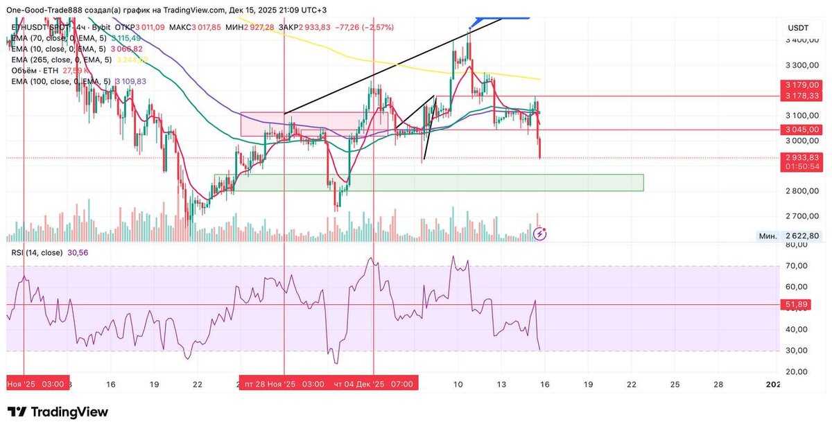 #ETH 🔸 Покупатели не смогли пройти выше 3283$. 🔸 Формируется ожидаемое снижение. 🔸 Ближайшая ключевая зона поддержки 2800$ - 2850$ 🔸 Если покупатели не удержат эту зону, а затем не вернут цену выше 3180$, стоит ожидать продолжение снижения. ❗️ Целевые зоны: 2390$ - 2467$ и 2100$.