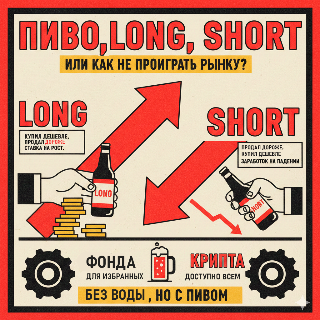 На фонде это для избранных, а в крипте – абсолютно всем доступны сделки с плечом в лонг и шорт. Звучит сложно? Щас разложим по полочкам под пиво. Лонг и шорт — это просто направление ставки: • ЛОНГ — ставка на то, что цена вырастет. Купил дешевле, продал дороже. • ШОРТ — ставка на то, что цена упадет. Продал дороже, купил дешевле. Как это организованно на фондовой бирже? ЛОНГ С ПЛЕЧОМ: Кредитуйся и богатей (в теории) Ты берешь у брокера деньги в долг, покупаешь на них акции, ждешь роста, продаешь, отдаешь долг с процентами, а разницу кладешь в карман. Зачем? Чтобы заработать больше, чем позволяют твои собственные деньги. Это как купить 10 кружек пива, имея деньги только на 2, в надежде продать их дороже. ШОРТ: Заработок на падении Здесь все наоборот – сделка имеет обратную последовательность. Сначала нужно продать то, чего у тебя нет. Как? Берешь у брокера акции в долг (да, такое тоже можно!), сразу их продаешь, ждешь, пока цена рухнет, покупаешь их обратно дешевле, возвращаешь б