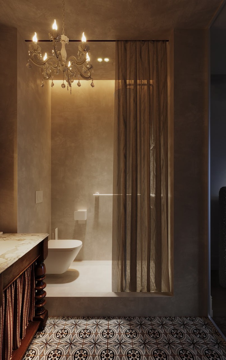 Душевая, наполненная естественным светом🧡 Продолжаем рассказывать о проекте #градиз_дом_у_озера. Благодаря прозрачной перегородке душевая получает естественный свет из спальни — пространство становится лёгким, глубоким и визуально более открытым. Все поверхности покрыты влагостойким микроцементом, из-за чего интерьер выглядит цельным, спокойным и современным.🌟 Пол выделили плиткой с орнаментом — она стала главным акцентом зоны. На её фоне эффектно смотрится резная тумба, дополненная зеркальным шкафом и изящной люстрой. Вид из спальни в сторону душевой получился особенно выразительным!⚡️ Еще одним интересным элементом стала люстра - Её изысканный дизайн в стиле барокко и арт-деко подчёркивает роскошь и величие интерьера. ✨ ⛳️Если хотите визуально расширить небольшую ванную — используйте однотонные покрытия, вертикальные световые линии и прозрачные перегородки. Смотрите полный проект в портфолио на сайте! ➿➿➿➿➿➿ www.gradiz.ru info@gradiz.ru 8-912-224-81-11