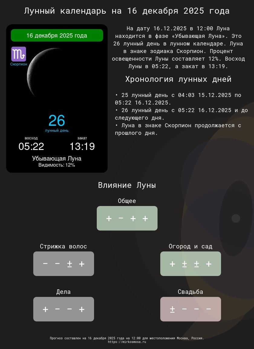 Лунные календари на 16 декабря 2025 года: Подготовьтесь к этому дню с учетом влияния Луны! 🔹🌗 Лунный календарь на 16 декабря 2025 года — Что приготовила Луна? Подробнее 🔹✂️ Лунный календарь стрижек на 16 декабря 2025 года — Подходящий ли день для обновления прически? Подробнее 🔹🌱 Лунный календарь огородника и садовода на 16 декабря 2025 года — Лучшее время для ухода за растениями. Подробнее 🔹📅 Лунный календарь дел на 16 декабря 2025 года — Удачные моменты для важных задач. Подробнее 🔹💍 Лунный календарь свадеб на 16 декабря 2025 года — Подходит ли этот день для вашего торжества? Подробнее
