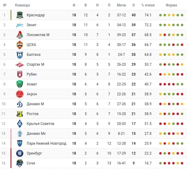 Как мы знаем, последние матчи 18 тура РПЛ были сыграны 7 декабря и наш чемпионат России по футболу поставлен на зимнюю паузу. Футболисты, тренерский штаб ушли в отпуск, а мы тоже отдыхаем от нашего футбола и начинаем уже немного скучать. Пока есть время подвести некоторые итоги сыгранных 18 игр чемпионата России. Лидеры: Краснодар, Зенит, Локомотив, ЦСКА, Балтика. ФК Краснодар продолжает удерживать первое место и ушёл на зимнюю паузу в статусе лидера. Не отпускает далеко от себя "быков" петербуржский Зенит. Вцепился в погоню довольно-таки цепко. Примерно одинаковые статистические показатели у Зенита, как и у Краснодара. Локомотив тоже на расстоянии одной победы от краснодарцев. При желании и при четкой игры на результат "железнодорожники" могут побороться за чемпионство. На данный момент Локомотив-самая забивная команда. Но есть нюансы. пропускает тоже Локомотив не мало, но положительный баланс держится. Шансы на чемпионство сохраняются и у ЦСКА, но такие принципиальные матчи в борьб