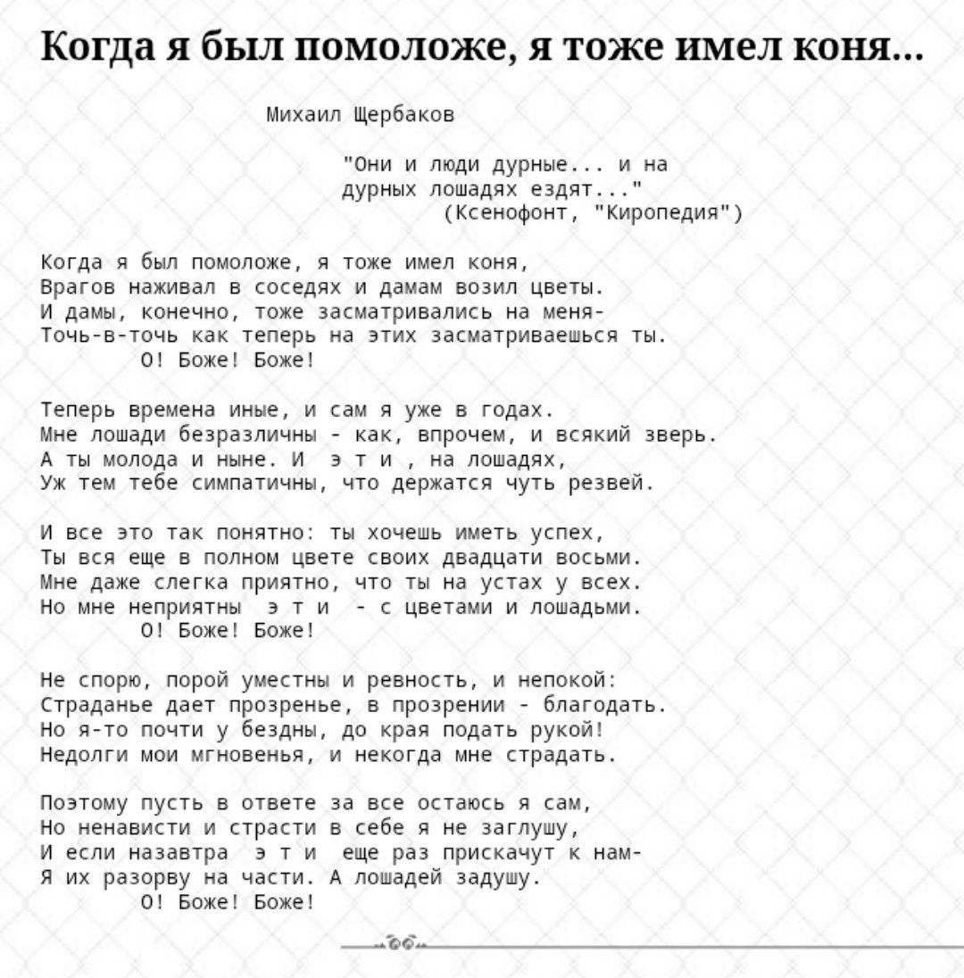 "Когда я был помоложе, я тоже имел коня" Вы даже не представляете, сколько в мире людей, которые главноеребятасердцемнестареть. Их и внешне толком не отличишь порой, и в толпе не заметишь, таятся, скрывают свое молодое пылкое сердечко и живую натуру, и я распознаю их, как правило, безошибочно, лишь по этой строчке, которая начинает напеваться у меня в голове в какой-то момент разговора. Тогда сразу начинаешь отмечать особые мелочи: сверкающие глаза, искрящуюся улыбку, морщинки у глаз, манеру смеяться во весь рот и громко, какую-то добрую открытость, цитрусовость, хихикательность, веселую суетность, отсутствие страха - да мир просто битком набит веселыми и задорными юношами и девчонками в возрасте лет от нуля лет до вечности лет, они прямо-таки рыщут толпами по улице, вооруженные своими улыбками, чтобы подловить тебя сонного древнего и глубинного, обезоружить яркостью натуры и биением жизни, напасть со своим оптимизмом и открытыми ясными взглядами, пока ты, весь такой василиск, щуриш