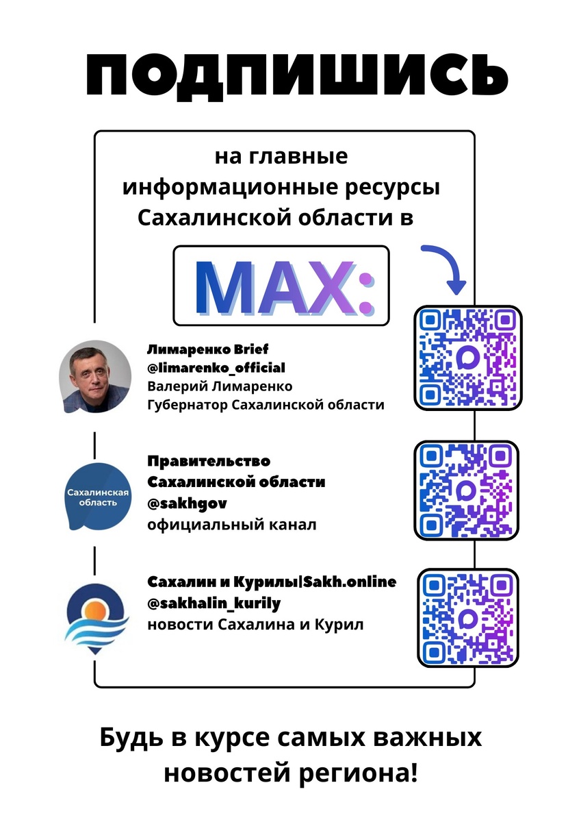 Узнавайте новости Сахалинской области напрямую от Губернатора и Правительства в мессенджере MAX 📣Уважаемые жители Сахалинской области! Подписывайтесь на официальные аккаунты Губернатора и Правительства Сахалинской области в национальном мессенджере MAX, чтобы быть в курсе самых важных новостей, решений и событий региона: - Официальный аккаунт Губернатора Сахалинской области: @limarenko_official - Аккаунт Правительства Сахалинской области: @sakhalinpso - Канал новостей Сахалина и Курил: @sakhalin_kurily 🤳Отсканируйте код, чтобы мгновенно перейти в мессенджер и подписаться на нужный канал. Это самый оперативный и доступный способ получать официальную информацию о жизни нашего края!