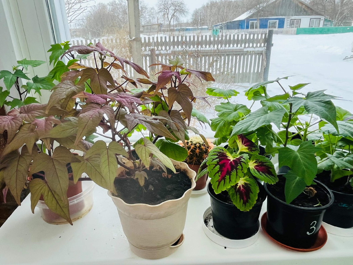 .Окно в большой комнате. Здесь еще более потянуты мои растюхи, потому что окно даже от редко появляющегося солнца прикрывает снаружи бузина Голд. Летом-то хорошо, оберегает от палящих лучей, а вот сейчас хоть и без листьев, но тень какая-то присутствует.