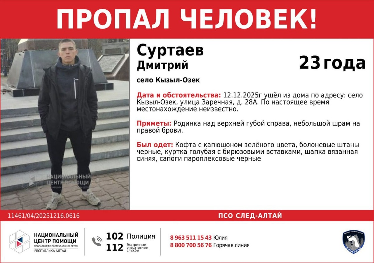 Пропал 23-летний парень в Майминском районе 12 декабря Суртаев Дмитрий ушёл из дома на улице Заречной в селе Кызыл-Озек и с тех пор его местонахождение неизвестно. У парня небольшой шрам на правой брови и родинка над верхней губой с правой стороны. Он был одет в зелёную кофту с капюшоном, черные болоньевые штаны, куртку голубого цвета с бирюзовыми вставками, вязаную синюю шапку и черные сапоги. Всем, кто владеет какой-либо информацией, просят обращаться по указанным в ориентировке номерам.