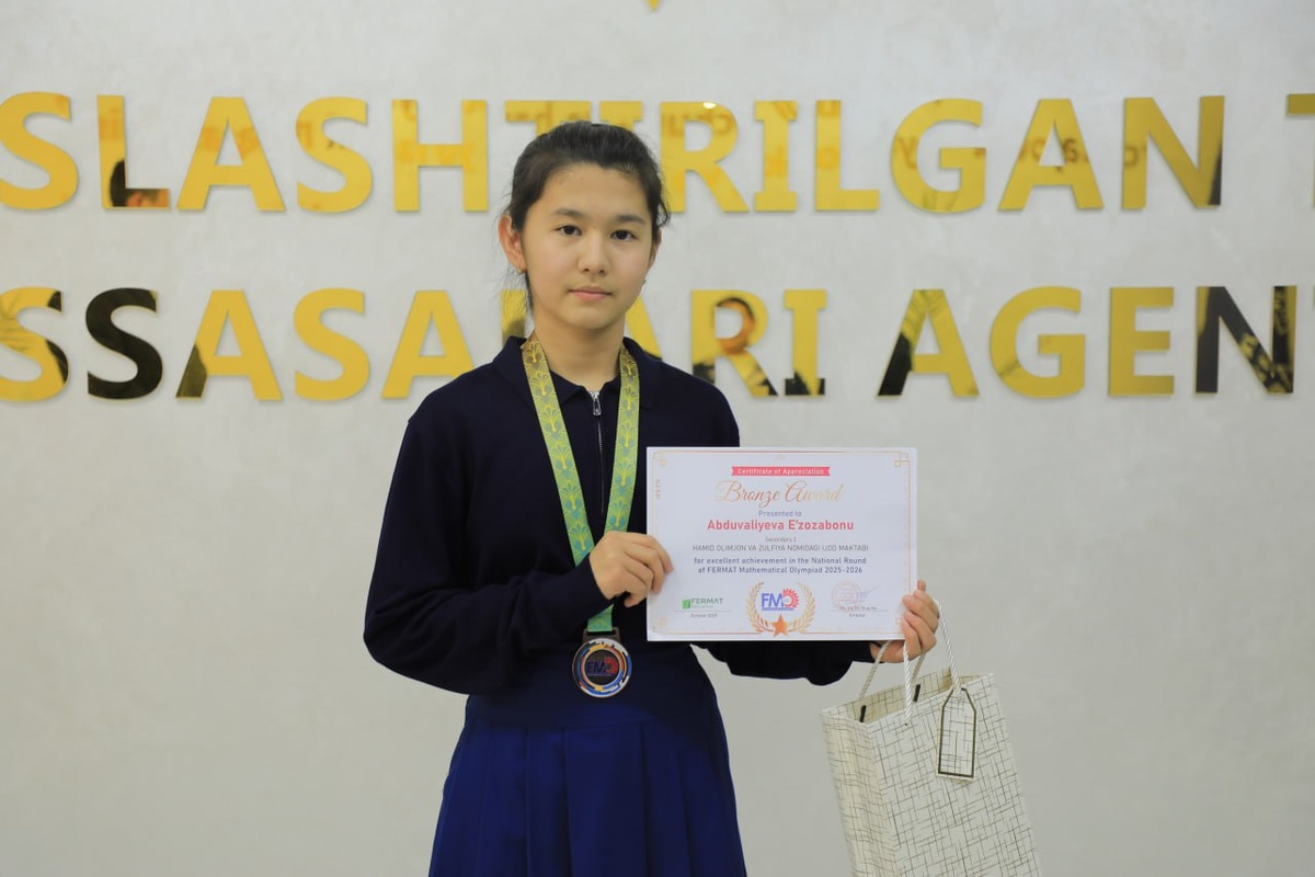 #иқтидор Жиззахлик ўқувчи халқаро олимпиадада иштирок этади Ҳамид Олимжон ва Зулфия номидаги ижод мактабининг 8-синф ўқувчиси Абдувалиева Эъзозабону FMO 2025 - Fermat Mathematical Olympiad - Вьетнам Халқаро математика олимпиадасининг Республика босқичида бронза медалига эга бўлди. Энди у 2026 йил январь ойида Вьетнамнинг Нҳа-Транг шаҳрида бўлиб ўтадиган финал босқичида иштирок этади. Куни кеча халқаро фан олимпиадалари ғолибларига пул мукофотлари топширилган эди. Ажаб эмас, Эъзозабону ҳам келгуси йилда тақдирланувчилар сафида бўлса. Каналимизга обуна бўлинг ва энг сўнгги янгиликларни кузатиб боринг Jizzaxnews |Тelegram | Facebook | Dzen | YouTubе