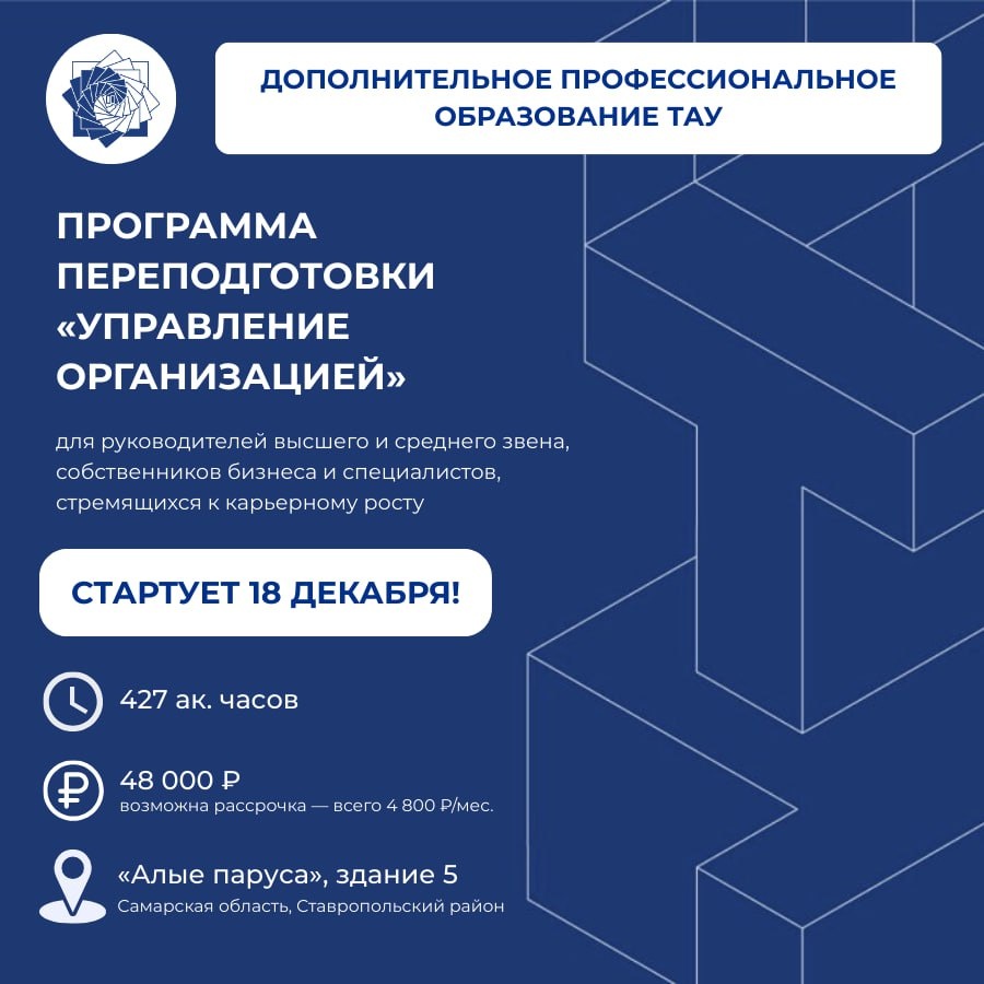 С 18 декабря в Тольяттинской академии управления начинается программа профессиональной переподготовки «Управление организацией» — для руководителей высшего и среднего звена, собственников бизнеса и специалистов, стремящихся к карьерному росту. Это проверенный социальный лифт: среди наших выпускников — руководители региональных органов власти, топ-менеджеры крупных компаний и успешные предприниматели. Почему программа актуальна именно сейчас? Содержание постоянно обновляется с учётом текущей экономической ситуации в Тольятти, Самарской области и России в целом. Мы отслеживаем ключевые тенденции в бизнесе, промышленности, финансах и управленческих технологиях, а также реальные вызовы, с которыми вы сталкиваетесь каждый день. Характеристики программы: Продолжительность: 427 академических часов Формат: очный, без отрыва от основной работы (вечерние занятия) Стоимость: 48 000 ₽ (возможна рассрочка — всего 4 800 ₽/мес.) Окончание: октябрь 2026 года (июль и август — каникулы) Занятия проходя