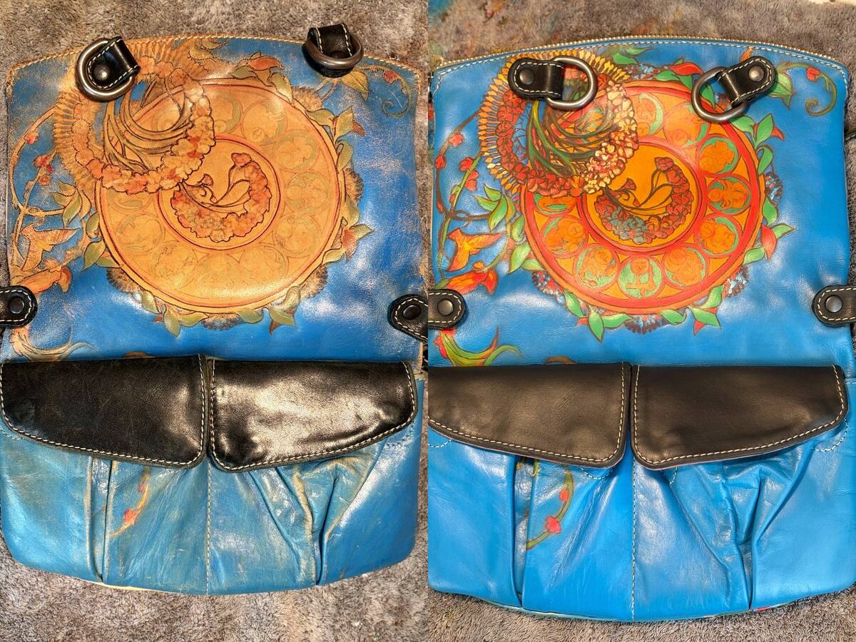 А такая работа у меня всего второй раз в жизни, реставрация заключалась в возвращении рисунка 🥺 Данный процесс оказался намного сложнее, чем обычная реставрация царапин и потертости. К счастью удалось найти фотографии оригинальной сумочки, что помогло более-менее нормально восстановить рисунок. Также работа над этой сумочкой заняла вдвое больше времени, но сам процесс расслаблял. Как вам результат? ✨