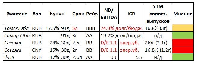 #облигации Размещения облигаций (15.12.2025) 🟡 Томская область (недавно уже размещалась, торгуется с текущим YTM 16.8%). Долг высоковат, но для муниципалов это не так страшно, можно попробовать спекулятивно (5 лет не хочется держать). 🟢 Самарская область - низкий долг, поэтому выше рейтинг. На момент написания поста не было ориентира по ставке. 15.5-16% было бы интересно. ❗️ У муниципальных облигаций есть амортизация, см. инфо в приложении брокера (амортизация сокращает дюрацию). 🔴 Сегежа - даже после допэмиссии долг все еще высоковат, но хуже то, что все еще сохраняется убыточность на операционном уровне. В целом думаю, Сегежа вырулит, возможно ценой еще одной допки, но все равно это риск. Кстати с Сегежей я обжегся и сам на прошлом юаневом выпуске, я его подсократил, но планирую держать. 🟢 ФПК - дочерняя компания РЖД, занимается пассажирскими перевозками. Не знаю как в целом у РЖД (вроде как сильно закредитованы), но конкретно у ФПК все хорошо по отчетности, мне кажется инт