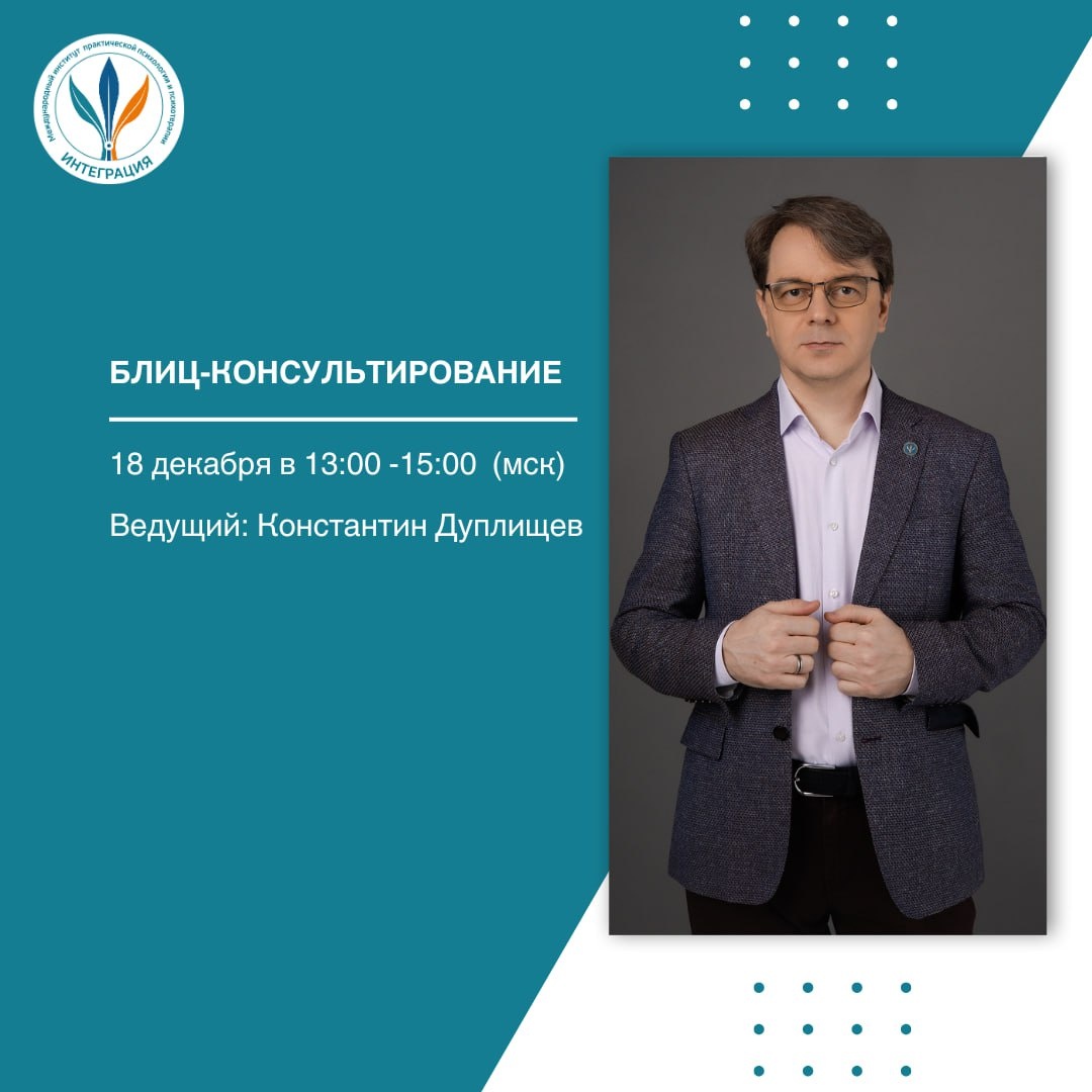 Застопорились в работе с клиентом? Не видите «слепых зон» в своей практике? Иногда достаточно одного взгляда со стороны, чтобы увидеть всё по-новому. 💡 18 декабря с 13:00 до 15:00 (МСК) пройдёт блиц-консультирование под руководством Константина Дуплищева. Блиц-консультирование — это живая демо-консультация в режиме «стоп-кадр»: вы наблюдаете, как работает терапевт, слышите его внутренние размышления и участвуете в обсуждении. А также можете провести свою мини-консультацию и получите обратную связь от эксперта и коллег. 🔥 Почему стоит принять участие? — Вы увидите, как формируется терапевтическая динамика через отношения «клиент–психолог». — Обнаружите свои сильные стороны и получите опору для дальнейшей работы. — Почувствуете поддержку сообщества. — Получите новые идеи и нестандартные решения, даже если работаете годами. Этот формат ценен как для начинающих, так и для опытных психологов, психотерапевтов и специалистов помогающих профессий, а также будет полезен студентам психолог