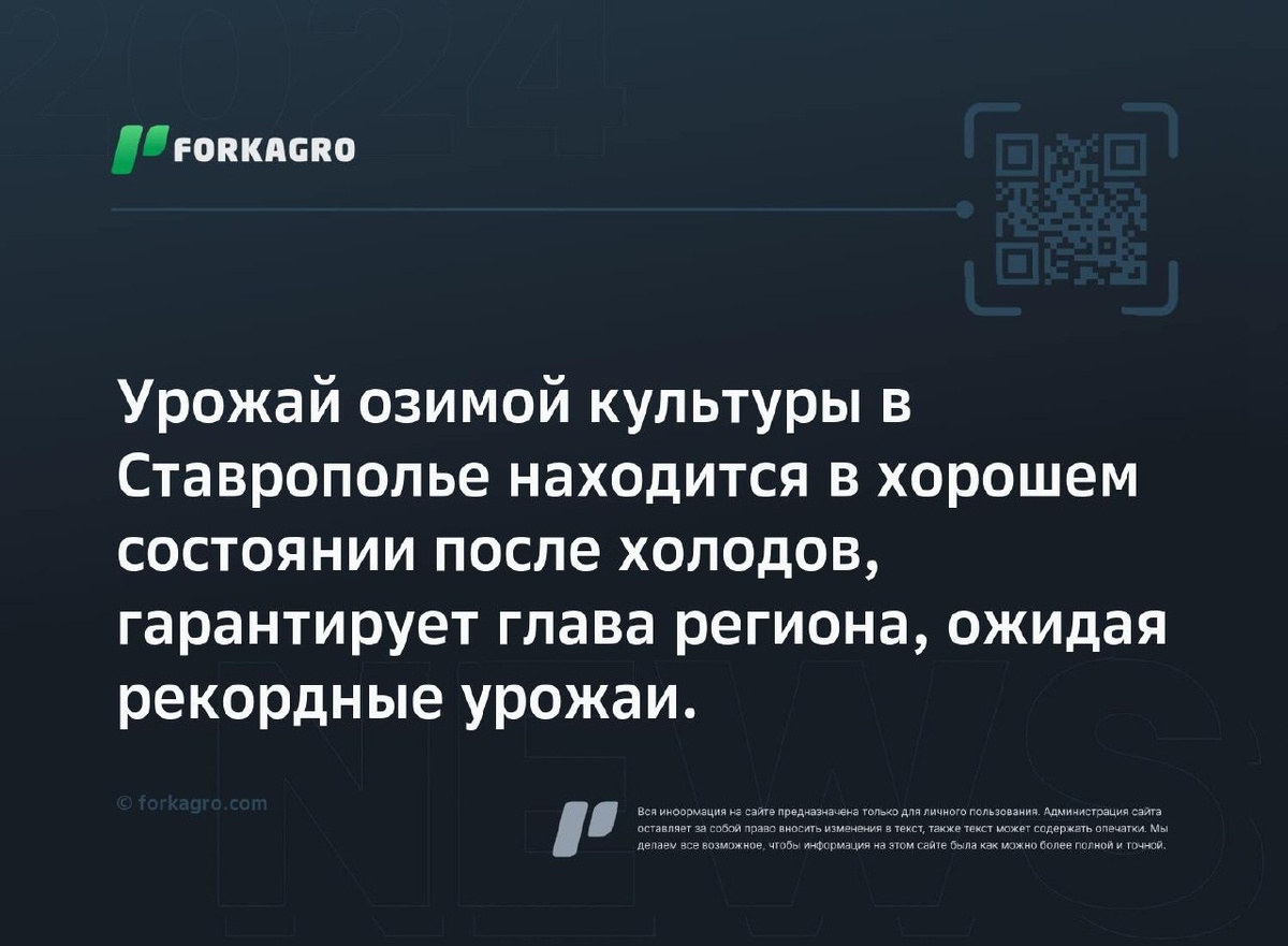 Урожай озимой культуры в Ставрополье находится в хорошем состоянии после холодов, гарантирует глава региона, ожидая рекордные урожаи. Первые заморозки в Ставрополье не повредили озимые культуры. Глава края подчеркнул хорошее состояние посевов озимой пшеницы, рапса и ячменя. Ситуацию ведут специалисты. Погоду назвал решающим фактором. В выходные шёл снег, дул сильный ветер. Уборка урожая зерновых и бобов завершена, набрано 10,6 млн тонн, что рекорд для региона. Перейти к источнику