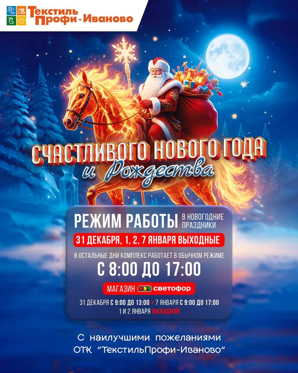 ! ✨🎄 Пусть эти праздники принесут тепло, радость и уют в каждый дом, а новый год будет наполнен приятными событиями и удачными покупками. Делимся режимом работы нашего комплекса в новогодние праздники. Сохраняйте, чтобы спланировать визит! 🕒 РЕЖИМ РАБОТЫ КОМПЛЕКСА В ПРАЗДНИЧНЫЕ ДНИ: 🎄31 декабря, 1, 2, 7 января - выходные дни. ✅В остальные дни комплекс работает в обычном режиме - с 8:00 до 17:00. 🟠Магазин "Светофор": 31 декабря с 9:00 до 13:00 🎄1 и 2 января - выходной 7 января - с 9:00 до 17:00 Рады видеть вас в "ТекстильПрофи-Иваново"!