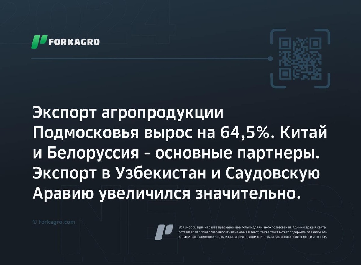 Экспорт агропродукции Подмосковья вырос на 64,5%. Китай и Белоруссия - основные партнеры. Экспорт в Узбекистан и Саудовскую Аравию увеличился значительно. Аграрии Подмосковья значительно увеличили экспорт масложировой продукции с начала 2025 года. Поставки масложировой, мясной и молочной продукции увеличились, достигнув 98,7 тыс. тонн, 260 тыс. тонн и 63,1 тыс. тонн соответственно. Также активно поставляется пищевая и перерабатывающая промышленность, зерновые культуры, рыба и морепродукты. Экспорт охватывает 78 стран, основными партнерами являются Китай и Белоруссия. Наибольший рост поставок наблюдается в страны Центральной Азии и Ближнего Востока. Перейти к источнику