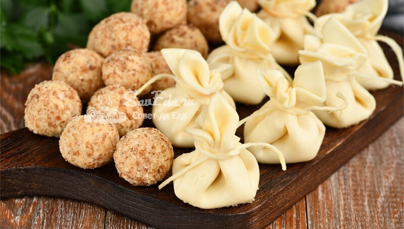 5 необычных вариантов подачи плавленого сыра, брынзы и адыгейского сыра. Такие закуски украсят сырную тарелку и сделают ее разнообразной. Все закуски готовятся очень просто и легко, а вкус и вид у них замечательные. 1 и 2. Две необычные закуски из обычного плавленого сыра. Шарики и мешочки. Для сырных шариков в миску выкладываем обычный пастообразный плавленый сыр (150 г, сливочный), он продается в ванночках. Дополняем сыр измельченными грецкими орехами (40 г) и мелко натертым чесноком (2 зубчика). Перемешиваем и получаем густую смесь. Измельченные грецкие орехи (30 г) высыпаем на тарелку. Из сырно-ореховой смеси формуем небольшие шарики (руки в воде не смачиваем), обваливаем их в орехах и еще раз скатываем между ладонями. Получается 18 сырных шариков. Для сырных мешочков пастообразный плавленый сыр (30 г) выкладываем в миску, добавляем мелко нарезанные оливки (7 шт.) и хорошо перемешиваем. Начинку можно придумать любую. Ломтики обычного плавленого сыра (8 шт. в пленке) по одному