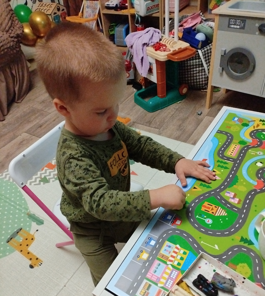 Сева рисовал дорогу. Потом действительно взял машины и катал по своей дороге. Кричит: "Ой, кивая даёга. Аваия!" И переворачивает машину. Пока Амелька коврик не отняла и не унесла. Началась борьба за коврик. Никак не могут, чтоб не спорить.