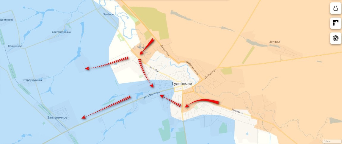 ❗️🗺Подразделения 57-й мотострелковой бригады и 127-й дивизии, а также 38-й бригады 35-й армии контролирует более 40 процентов территории Гуляйполя с уверенным закреплением на западном берегу р. Гайчур. Единственная дорога снабжения для гарнизона ВСУ со стороны н.п. Зализничное (Железнодорожное) под присмотром дроноводов ГрВ "Восток". В развалинах, в подвалах, находят огромное количество трупов солдат ВСУ, это результаты прилетов ФАБ-ов. Более 100 бомб было применено по Гуляйполю за последние несколько дней. https://dzen.ru/id/6425916a1950720421f18802