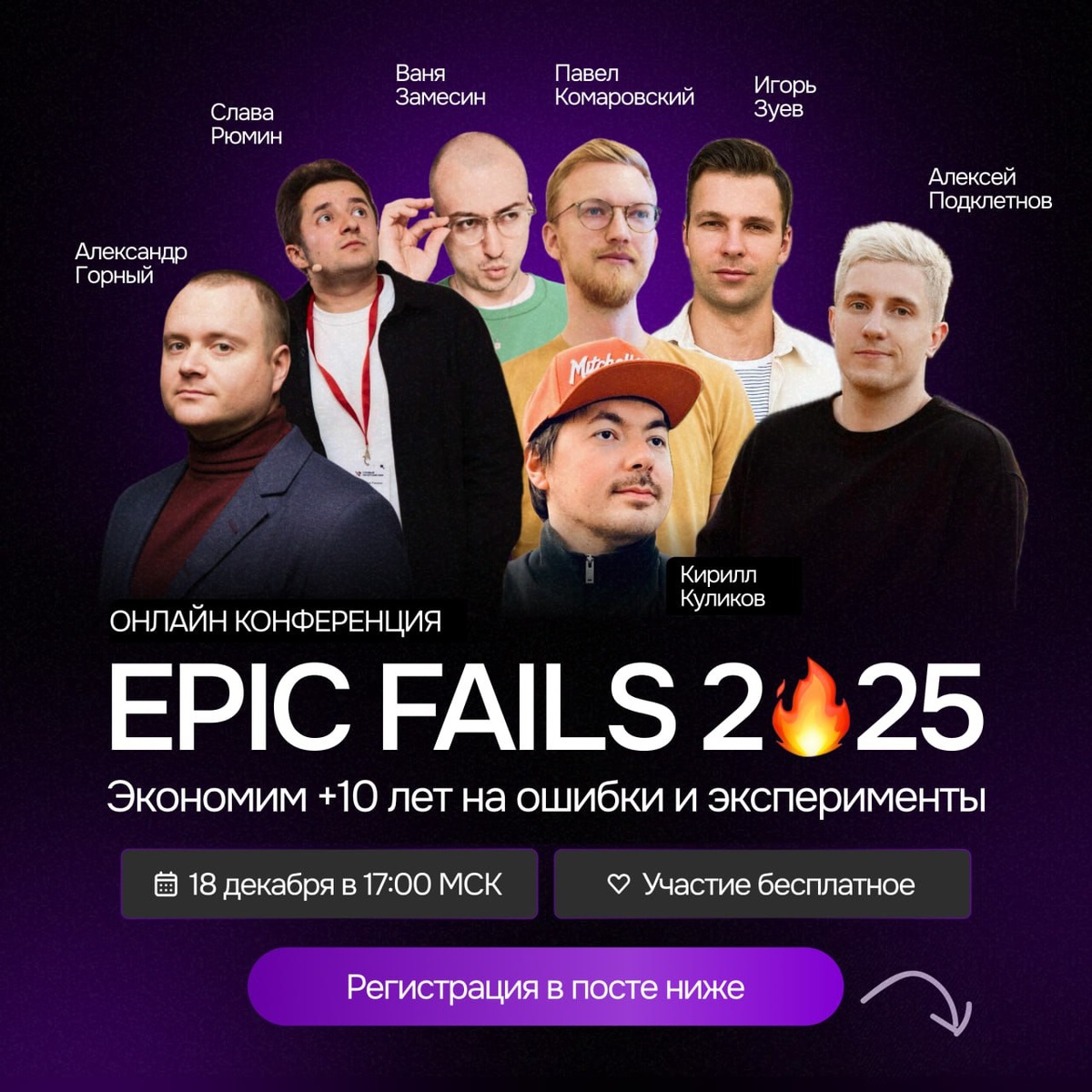 У кого-то случалась катастрофа в бизнесе, у кого-то в инвестициях. Я свою главную ошибку сделал в 7 лет, когда экстерном проскочил один из классов и в итоге закончил школу в 15 вместо 17, как нормальные люди. Расскажу, зачем это было, к чему привело и как потом лечил симптомы. Epic Fails 2025: 18 декабря (четверг) с 17:00 до 21:40 Мск (онлайн) Кто еще будет выступать: Ваня Замесин: Боль – жить не свою жизнь. Почему так получается, как заметить и что с этим делать. Расскажу свою историю, как я нашёл дело своей жизни и перестал страдать. Алексей Подклетнов: Как я испортил свой YouTube-канал из-за одной ошибки. И что делаю, чтобы всё исправить. Слава Рюмин: 4 млн долгов. Система, которая помогла мне вылезти из главной ямы в своей жизни, дала 2 оффера в неделю и вырастила блог до 55К. Игорь Зуев: Как я зафакапил 14 попыток сделать свой онлайн-проект. Что изменил в подходе, чтобы 15-ый не пошел тем же путем. Павел Комаровский: Как я проиграл в инвестициях обезьяне c IQ 32. Люди не ум