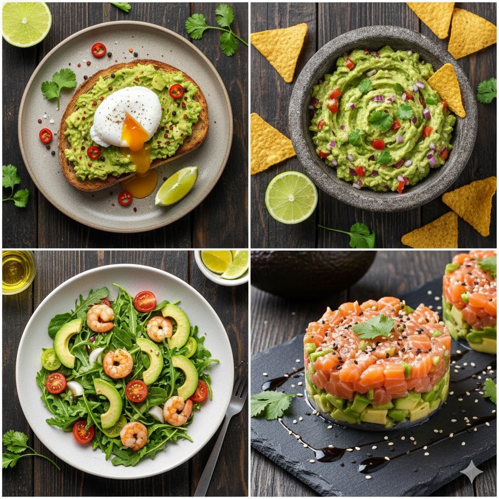 Идеальный, сытный и быстрый завтрак. Самая известная закуска из авокадо. Отлично сочетается с кукурузными чипсами (начос) или овощами. Легкий и изысканный салат. Очень питательный и полезный напиток для перекуса или завтрака. Элегантная закуска, которую можно подать в кольце или тарталетке.