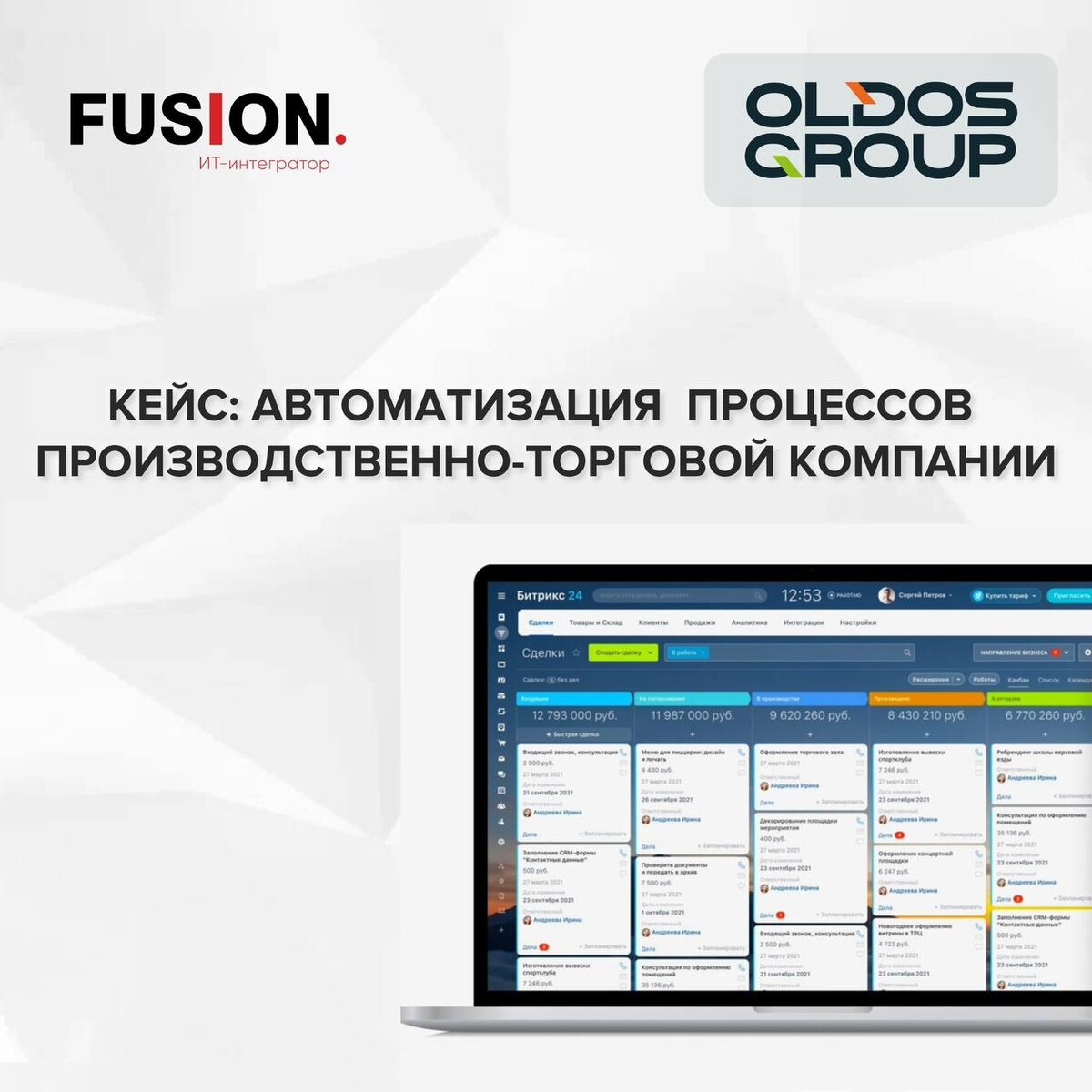 Компания OLDOS работает на российском рынке тканей с 1993 года и давно завоевала репутацию надежного партнера. С 2000 года фирма предлагает текстильную фурнитуру, а в 2016 году открыла собственное ленто-ткацкое производство. Имеет 11 филиалов по всей стране и офис в Китае. На фоне роста бизнеса внутренние процессы велись в разрозненных программах, что снижало прозрачность, осложняло управление и контроль. После анализа процессов компании наша команда внедрила и настроила корпоративный портал на базе Битрикс24 и автоматизировала HR-направление, а также основные процессы B2B продаж. Егор Ралдугин, IT-директор OLDOS GROUP: За первый год мы перевели компанию на Битрикс так, что сотрудники не могут представить работу без портала. Централизация, автоматизация и удобство работы ощутимы для всех. Сотрудники отмечают, что задачи и документы теперь легко отслеживать, а согласования проходят быстрее. Битрикс стал неотъемлемой частью повседневной работы. Подробнее о внедрении читайте в кейсе п