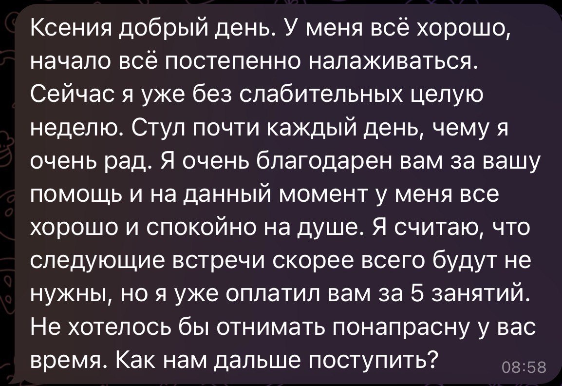Что могло пойти не так? Мы провели 5 консультаций, и у него был значительный прогресс. М. несколько месяцев страдал из-за запоров, которые не уходили на фоне тревоги. Началось все так: у М. заболела нога и он пошел к врачу. Тот прописал препараты. М. внимательно изучил инструкцию и побочки. Самые серьезные – запоры. Тогда М. не придал этому значения. Но вот он начал курс, и начались проблемы со стулом. «Ерунда», – подумал М. «Сейчас допью таблетки 2 недели, и все пройдет.» Но не проходило. Кишечник замедлялся, и практически остановил свою работу. Однажды М. пришел на работу и увидел рыдающую коллегу, рядом с которой столпились остальные сотрудники. Оказалось, что у ее мужа начались запоры, и он пошел к врачу. Это были не просто запоры, а рак простаты. М. растревожился. Он давно закончил пить таблетки со странной побочкой. Он начал следить за работой кишечника и контролировать свой стул. Просыпался с тревогой. Применял слабительные каждый день, чтобы точно сходить в туалет. Когда о