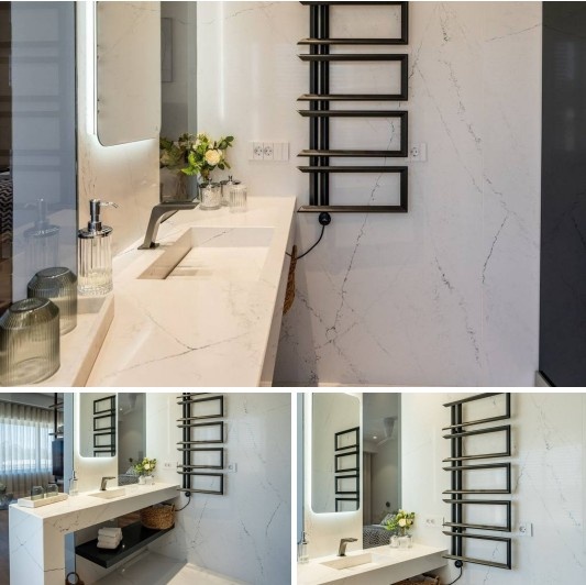 Ванная комната — это место, где мы начинаем и заканчиваем свой день. Здесь важны не только функциональность и комфорт, но и атмосфера чистоты, гигиены и эстетики. Современные материалы позволяют создавать интерьеры, которые отвечают всем этим требованиям. Одним из лидеров в этой области является кварцевый агломерат Silestone, предлагающий уникальное сочетание красоты натурального камня и непревзойденных эксплуатационных характеристик. Давайте рассмотрим, как можно использовать Silestone для создания ванной комнаты вашей мечты. 1. Столешницы - идеальная поверхность Столешница в ванной — один из самых используемых элементов. Она постоянно контактирует с водой, косметическими средствами и бытовой химией. Столешницы из Silestone идеально подходят для таких условий. Благодаря своей непористой структуре, они не впитывают влагу, красители и запахи. На них не образуются пятна от зубной пасты, макияжа или мыла. Поверхность Silestone чрезвычайно устойчива к царапинам и легко очищается, сохраняя
