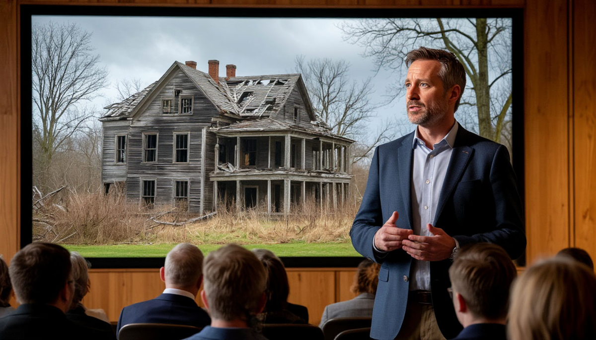 Зал современного культурного центра был полон. На экране за спиной у Леонида светился не безупречный 3D-рэндер, не график успешных проектов, а старая, зернистая фотография. На ней — «Белая Роща» на следующее утро после того шторма. Зияющая дыра в крыше, поваленные деревья, грязь, хаос. Абсолютный провал любого архитектора.