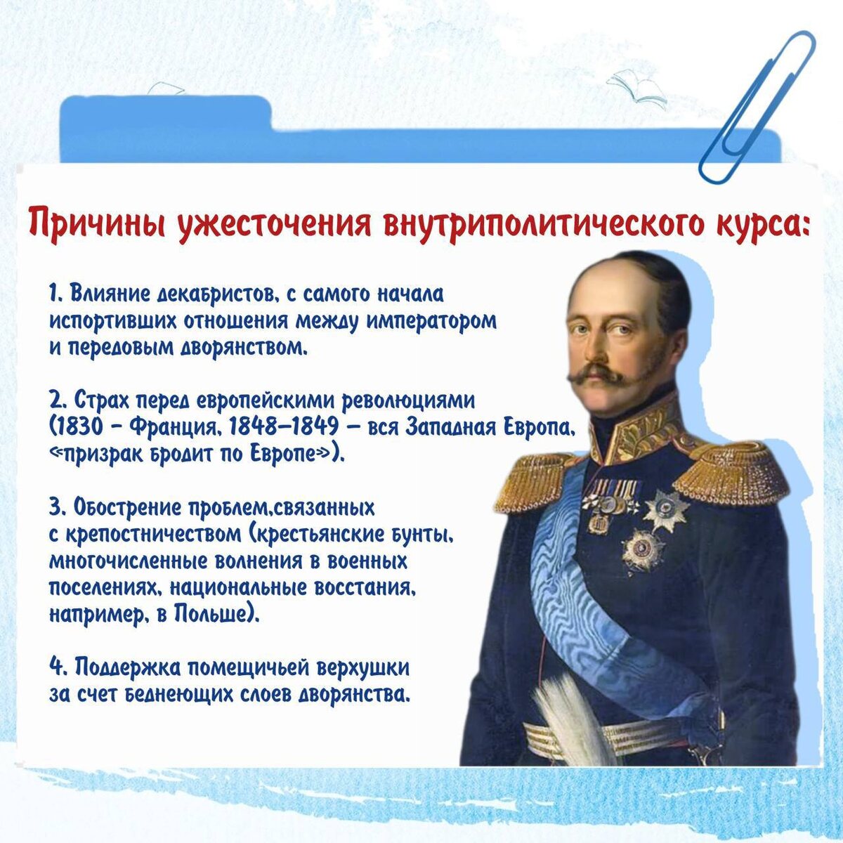 На днях мы с вами изучили важную тему — Восстание декабристов! Предлагаю начать разбор периода правления Николая I👑 ⁉️Начнем? Особенности политической власти в России в середине XIX в. (в сравнении с петровской эпохой) ❗️Сохранилось на протяжение XVIII – I половины XIX века: абсолютная монархия (самодержавие), отсутствие принципа разделения властей, сохранение Сената и Синода как высших органов государственной власти! ❗️Новые элементы политического устройства: ✔️ министерства вместо коллегий ✔️деятельность Государственного совета ✔️деятельность комитета министров вместо кабинета (личной царской канцелярии) ✔️появление различных отделений Собственной Его Императорского Величества Канцелярии Изучите карточку с причинами ужесточения внутриполитического курса👆 Свидетельства ужесточения курса: 🟢Оформление теории официальной народности Уварова («православие–самодержавие– народность») 🟢Создание III отделения («царской охранки», жандармов) 🟢Милитаризация государственного аппара