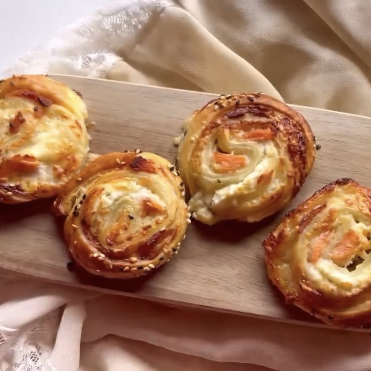 🔗Видео-рецепт в конце статьи🎥 Если нужен эффектный аперитив к празднику, который выглядит «вау», а готовится за считанные минуты — этот рецепт точно стоит сохранить. Хрустящее слоёное тесто, нежный копчёный лосось и тянущаяся, сливочная буррата создают идеальное сочетание вкуса и текстур. Минимум ингредиентов, максимум удовольствия — именно такие рецепты всегда выручают перед гостями. Ингредиенты • Слоёное тесто — 1 пласт • Сливки (жирные) — 100 мл • Тёртый сыр (грюйер или аналог) — 20 г • Буррата — 1 шар • Копчёный лосось — 200 г • Семена кунжута и мака — для посыпки Как приготовить Разверните пласт слоёного теста. Равномерно распределите сливки и посыпьте тёртым сыром. Выложите ломтики копчёного лосося по всей поверхности теста. Буррату разорвите на крупные кусочки и распределите поверх начинки. Аккуратно сверните тесто в плотный рулет. Посыпьте кунжутом и маком. Нарежьте рулет на одинаковые кусочки и выложите их на противень, застеленный пергаментом. Выпечка В духовке с конвек