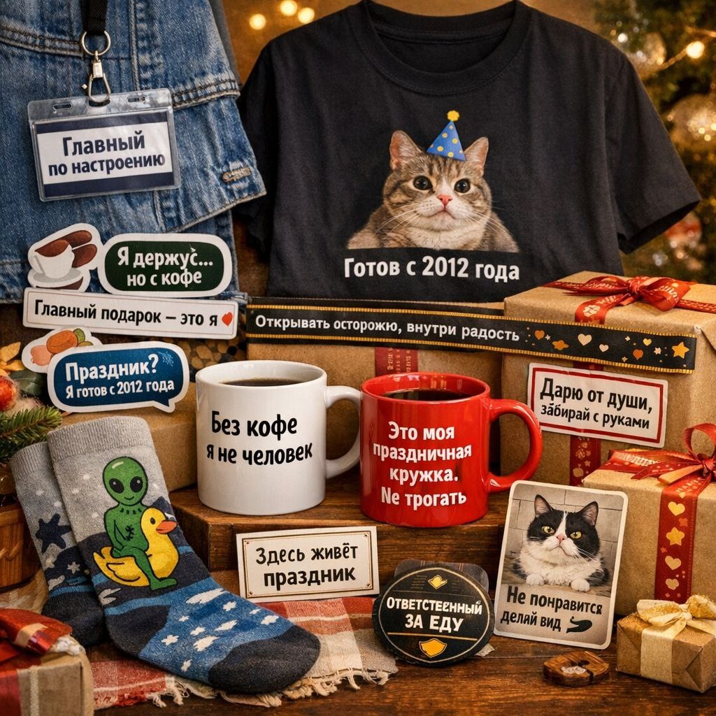 Открытка — это мило. Но чаще всего она живёт ровно 7 секунд: — открыли — прочитали — сказали «спасибо» — положили туда, где лежат остальные открытки 😅 А вот варианты, которые живут дольше и веселят сильнее: 😂 1. Стикеры с внутренними шутками Фразы вроде: «Я держусь… но с кофе» «Главный подарок — это я» «Праздник? Я готов с 2012 года» Можно клеить на телефон, ноутбук, холодильник и даже на жизнь. 🧦 2. Принты на одежде (да, даже на носках) Футболка, худи или свитер с: мемом года фразой, понятной только «своим» максимально странным, но смешным рисунком Чем нелепее — тем уютнее. Проверено. 🎁 3. Ленты для подарков с подколами Зачем писать «С праздником», если можно: «Открывать осторожно, внутри радость» «Дарю от души, забирай с руками» «Если не понравится — делай вид» Даже самая обычная коробка сразу становится шоу. ☕ 4. Кружки с честными надписями Не «Счастья и успехов», а: «Без кофе я не человек» «Это моя праздничная кружка. Не трогать» «Дарили с любовью. Пользуйся аккуратно» Пьют из