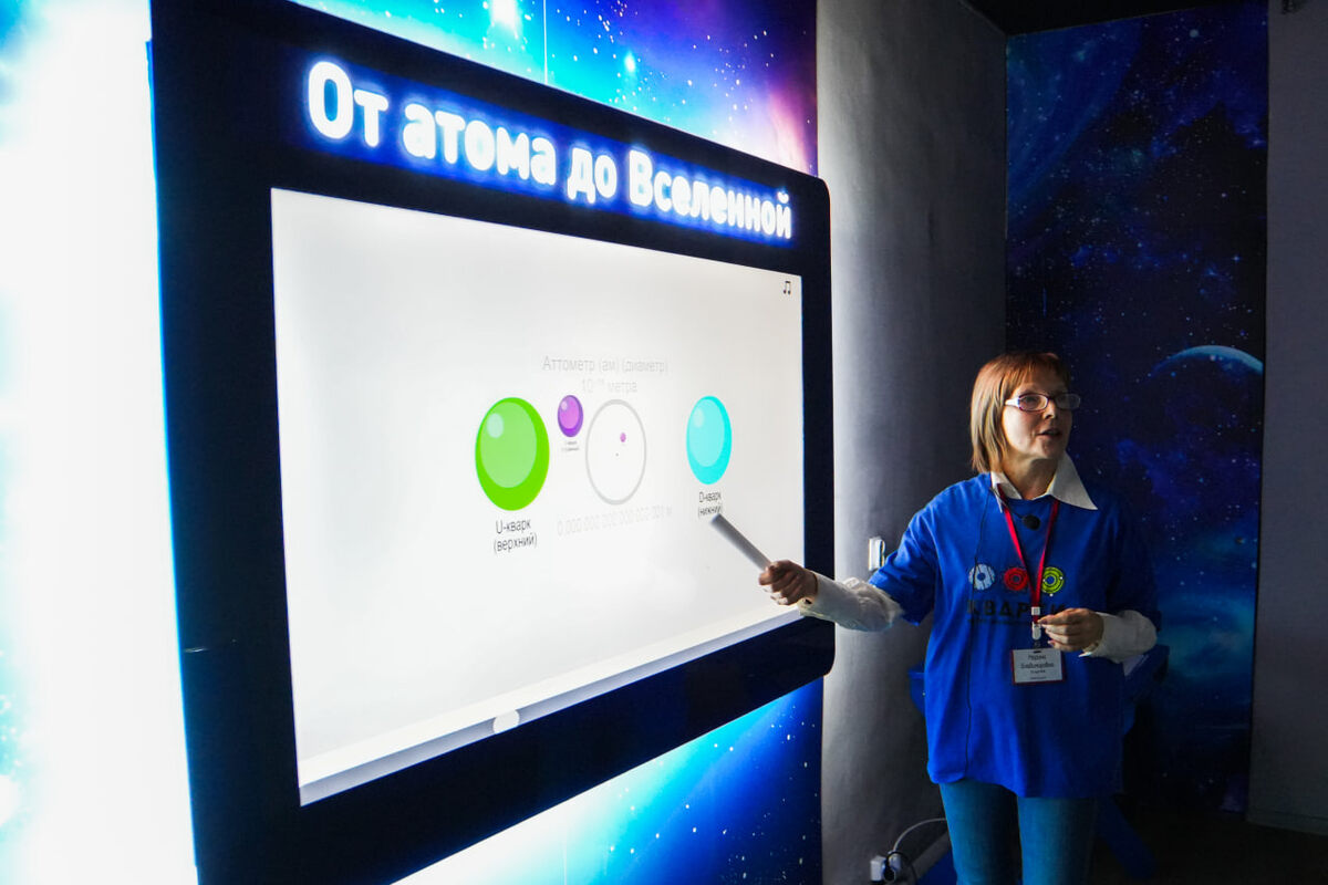 В музее занимательных наук «Кварки», расположенном в нижегородском ЦУМе на 3-м этаже, появился новый обзорный научный экспонат под названием «От атома до Вселенной». Уже сейчас можно посетить обзорные мини-экскурсии и прикоснуться к удивительным макро- и микромирам. В ноябре 2025 года в музее состоялось торжественное открытие нового экспоната – интерактивной видеоинсталляции «От атома до Вселенной». Проект стал возможен благодаря грантовому благотворительному конкурсу «Росатом» в 2025 году. Была проделана огромная работа, чтобы гости музея смогли отправиться в захватывающее путешествие, в ходе которого возможно изучить мельчайшее строение атомов и бескрайних просторов Вселенной! Инсталляция, включающая более 200 познавательных объектов, позволяет ощутить масштабы окружающего мира, открывая завесу тайн природы от элементарных частиц до галактических глубин. Уже начались обзорные мини-экскурсии, для посещения необходимо приобрести входной билет в музей на кассе или на сайте. Также на с