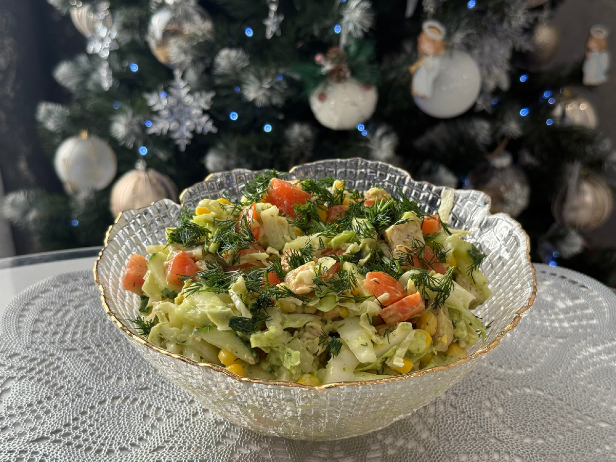 Спешу поделиться рецептом вкуснейшего салата. Салат прост в приготовлении, в нем отлично сочетаются все продукты. Изюминка этого салата - соус. Интересная идея разнообразить зимнее меню. Попробуйте приготовить. Ингредиенты : Пекинская капуста - 300 г Огурец - 2 шт Помидор - 1 - 2 шт Кукуруза - 1 банка Куриное филе - 250 г Авокадо - 1 шт Натуральный йогурт - 2 ст.л Укроп - 2 веточки Сок лимона Соль Перец Готовим: Начинаем с подготовки куриного филе. Куриное филе нарезаем тонко , смазываем специями. Отправляем на сковородку с маслом и обжариваем с двух сторон до золотистой корочки. Приступаем к овощам. Нарезаем пекинскую капусту и отправляем в миску. К капусте отправляем мелко нарезанный огурец. Так же в миску отправляем помидоры нарезанные кубиками и кукурузу. Обжаренное куриное филе даем остыть и нарезаем кубиками. Отправляем в салат. Для соуса в блендер добавляем мелко нарезанное авокадо. Добавляем натуральный йогурт. Так же добавляем укроп, лимонны