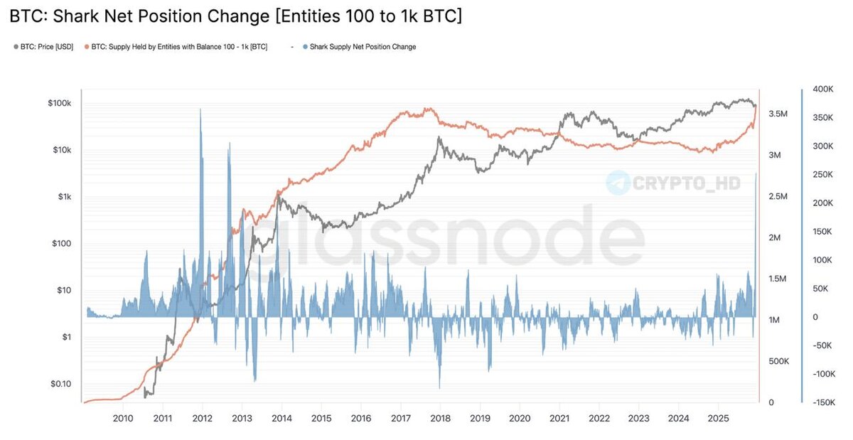🦈 Glassnode: Акулы купили 54,000 BTC (~$4,66b) за последнюю неделю – максимальные темпы накопления с 2012 года.