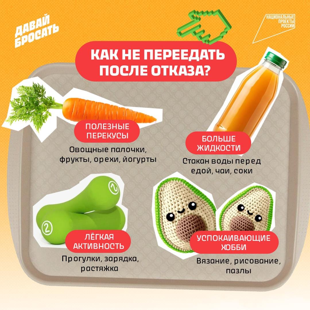 🔍 Слежка прошла успешно! Мы внимательно наблюдали за беседой под последним постом рубрики #вопрос_из_зала 💬 И выяснили, что до сих пор беспокоит многих наших подписчиков: набрать вес после отказа. Почему так происходит? Всё просто: когда уходит никотин из твоей жизни, часто появляется желание «заесть» тревогу, занять руки и рот чем-то ещё. Так мозг ищет новый способ получить успокоение. 💡 Мы собрали на карточке топ-4 идеи, чем заменить вредные перекусы. Выбирай свой фаворит и внедряй постепенно! А в комментариях пиши, что помогает тебе не переедать, когда нервничаешь или скучаешь? 👇