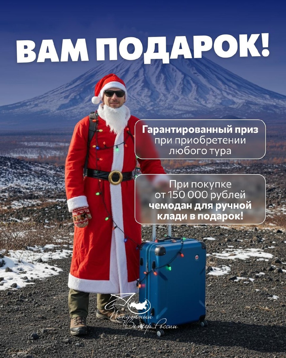 🎄Последние дни предновогодней раздачи подарков от «Попутного ветра России» До 20 декабря вас ждут гарантированные призы при приобретении тура по любому направлению! А при покупке от 150 000 ₽ – вы получите стильный чемодан ручной клади в подарок! 🧳✈️ Подробности у менеджера: @wildtail_tour