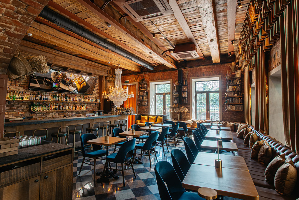 Здесь, под сверкающей хрустальной люстрой, парящей над барной стойкой, время течёт иначе. Сводчатые кирпичные стены, мерцание свечей, разноцветные склянки на полках, сухоцветы в сосудах и корзинках, тяжёлые портьеры создают ауру тайны.