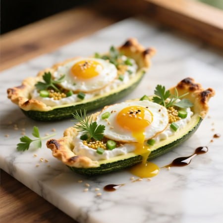 Подсмотрела интересный рецепт и не могу не поделиться! 🥒✨ Цукини с творожной начинкой и яйцом-пашот — это блюдо, которое выглядит как шедевр из меню хорошего ресторана, и готовится удивительно просто. Хрустящие «лодочки», нежный крем и тот самый волшебный текучий желток… Идеальный баланс белка, клетчатки и восхитительного вкуса! 🥒 Ингредиенты (на 2 порции = 4 тарталетки) Для основы: - 1 крупный цукини (или 2 средних, ~300 г) - 1 ст. л. оливкового масла - Щепотка соли, чёрного перца, чесночного порошка Для творожной начинки: - 150 г мягкого творога (до 5%) - 70 г греческого йогурта или сметаны 10% - 1 ч. л. дижонской горчицы - Пучок свежей зелени (укроп, петрушка, зелёный лук) - Соль по вкусу Для сервировки: - 4 перепелиных яйца (или 2 куриных) - Руккола, микрозелень - Кунжут или семена чиа для посыпки 👩🍳 Пошаговый рецепт 1. Подготавливаем «лодочки». ➖ Духовку разогрейте до 200°C. ➖ Цукини вымойте, разрежьте вдоль пополам. Ложкой аккуратно выскоблите часть мякоти с семенами, создав