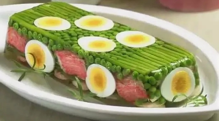 Заливное из рыбы со спаржей и зелёным горошком Ингредиенты: рыба (филе) — 200 г; спаржа — 120 г; зелёный горошек (замороженный) — 80 г; лимонный сок — 2 ст. л.; яйца (варёные) — 2 шт.; желатин — 20 г; соль — по вкусу. Приготовление: Спаржу нарежьте кусочками и сварите в подсоленной воде вместе с зелёным горошком. Филе рыбы сбрызните частью лимонного сока и припустите на слабом огне до готовности. Желатин замочите в холодной кипячёной воде до набухания крупинок, затем откиньте на сито. Рыбу разберите на кусочки, смешайте с овощами, разложите в порционные формочки и оформите нарезанными кружочками яйцами. Рыбный бульон и овощной отвар процедите, соедините, доведите до объёма 500 мл, добавьте оставшийся лимонный сок, подготовленный желатин и доведите смесь до кипения. Желе слегка охладите, залейте им рыбу с овощами и охлаждайте до застывания. Перед подачей формочки опустите на несколько секунд в горячую воду, выложите заливное на блюдо. Оформите зеленью. Заливное из рыбы со спаржей и аг