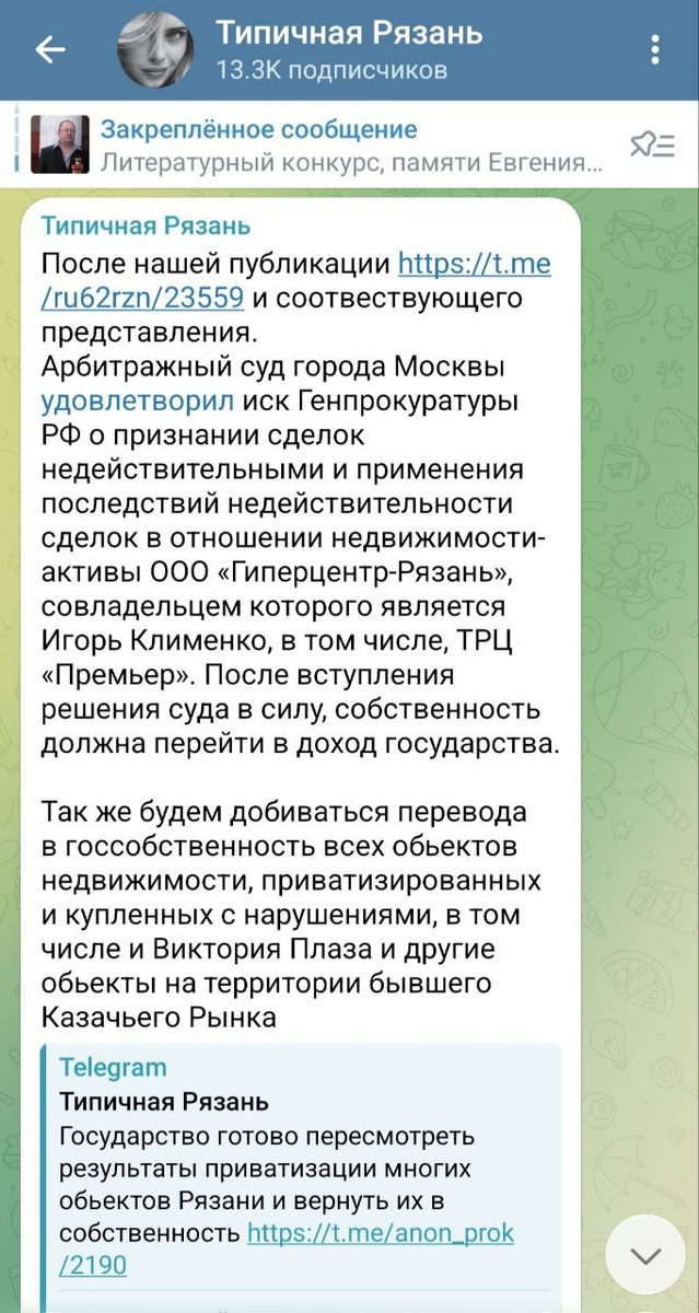 «Типичная Рязань»: сушить сухари или уходить на пенсию Главред «Своей колокольни» в СИЗО, а где же всемогущий маг всея Рязани и владелец ЗАРЕГИСТРИРОВАННОГО в Роскомнадзоре ТГ-канала «Типичная Рязань» Валерий Разорёнов, который так активно помогал? По слухам, сейчас он ходит с бубном, поклоняется камням и сушит сухари, готовясь к переезду на новые территории и началу новой жизни, при этом, находясь ещё на территории Рязанской области, постоянно влезает в истории не своего «полёта». Более 50 потенциально интересных правоохранительным органам публикаций насчитали, зафиксировали и передали «куда следует» люди, которые знают «тему» и готовы свидетельствовать. Но, полагаем, Валерию и этого мало: на днях в данном паблике вышла статья о том, что якобы после какой-то совсем не значимой публикации в канале с 13 тысячами накрученных подписчиков арбитражный суд Москвы признал недействительными сделки в отношении ООО «Гиперцентр-Рязань» (ТРЦ «Премьер»), совладельцем которого является известный в