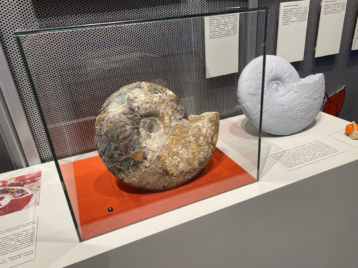 Аммониты – древние морские животные, жившие на Земле около 400 миллионов лет назад, начиная с девонского периода и заканчивая меловым, примерно 66 миллионов лет назад. Это головоногие моллюски, родственники современных кальмаров, осьминогов и каракатиц. Название "аммонит" произошло от древнеегипетского божества Амона, изображавшегося с рогами барана, напоминающими спирали раковин аммонитов. Раковины этих животных имели сложную структуру: внутри было много камер, соединенных каналом сифоном. Живое тело занимало лишь последнюю камеру, остальные использовались для регулировки плавучести. Размеры аммонитов самые разные: от мелких экземпляров размером с монету до гигантов диаметром более двух метров. Их изобилие поражает: палеонтологи насчитывают более десяти тысяч видов. На выставке «Рейс в мезозой: Планетарий – метро» представлены несколько ископаемых аммонитов мелового периода из коллекции ГБМТ, найденных в разные годы в окрестностях Ульяновска. Самый крупный имеет диаметр 37 см. А вот