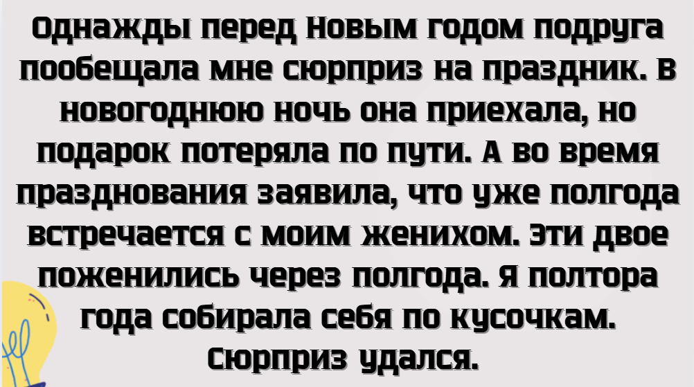 Муки беременности, невнимательность мужа, разборки со свекровью: вот лишь малая доля проблем, которые выпадают на долю девчат. Кажется, что жизнь разыгрывает женщин на каждом шагу, тихо посмеиваясь над ними. Пользовательницы сети рассказали о том, что у них наболело-накипело. Рекомендуем также заглянуть сюда 👇👇👇 Парень подарил мне хорошее кольцо, типа сделал предложение. Я сказала, что подумаю. Через неделю во время поездки открыла его паспорт и увидела там штамп. Он сказал, что уже разведен, просто не поставил штамп. Свидетельства о разводе у него тоже нет, даже не знает, что это такое. Я его бросила прямо там. Для меня дикость — делать предложение, если даже нет документов о разводе. В сети сейчас ходит шутка, что если вы коллега, то подарок на восьмое марта получите седьмого числа, если девушка, то восьмого, а если жена, то вам вообще ничего не подарят. Я смеялась, когда увидела эту шутку, но в день праздника мне было не смешно. Утром муж не поздравил меня и ушел на работу. Я п