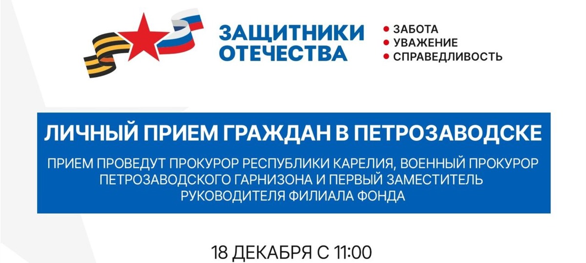 Прокурор Карелии и военный прокурор Петрозаводского гарнизона проведут личный прием участников специальной военной операции и их семей. 18 декабря на базе карельского филиала фонда «Защитники Отечества» состоится личный прием граждан, организованный прокурором Республики Карелия Дмитрием Харченковым, военным прокурором Петрозаводского гарнизона Павлом Газзаевым и первым заместителем руководителя филиала фонда Верой Фесенко. На прием приглашаются участники специальной военной операции (СВО) и члены их семей. В ходе встречи они смогут обсудить волнующие их вопросы, связанные с правовой защитой, социальной поддержкой и другими аспектами, требующими внимания прокуратуры. Прием будет проводиться с 11:00 по адресу: г. Петрозаводск, ул. Свердлова, д. 1. Для участия в мероприятии требуется обязательная предварительная запись. Записаться на прием можно по телефону филиала фонда (8-814-2) 44-53-10; лично в филиале фонда по указанному адресу. Филиал работает с понедельника по пятницу с 9:00 до 18