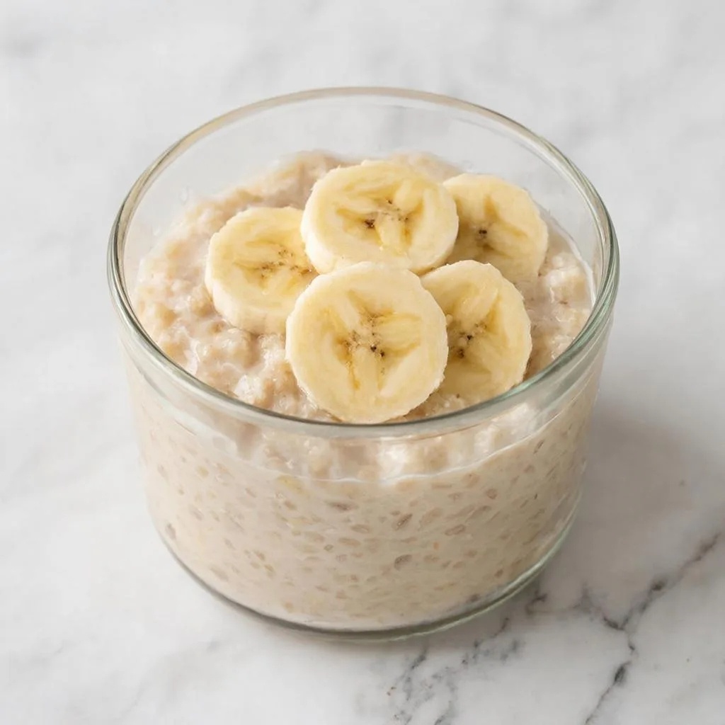 Калорийность порции: около 285 ккал (овсянка 128 ккал, кефир 50 ккал, банан 107 ккал) — сытно и легко.