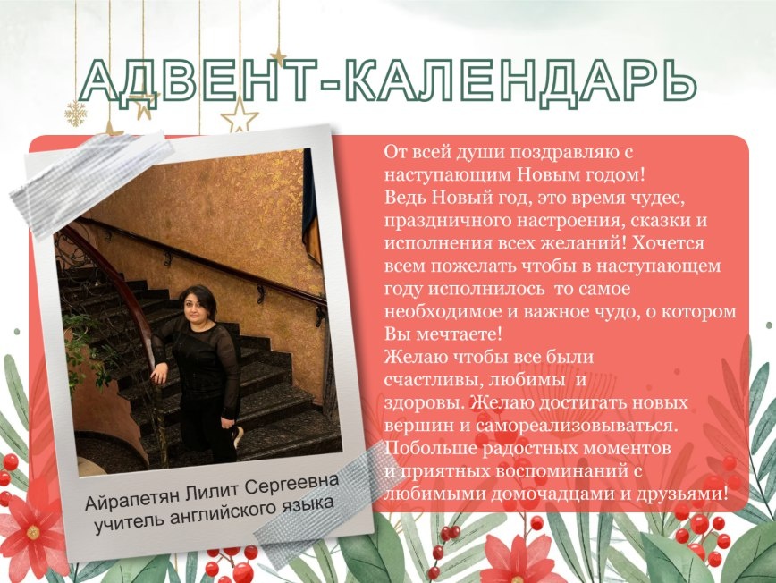 Шестой день нашего адвент-календаря🎄 Продолжаем делиться с вами новогодним настроением! Сегодня тёплыми словами с вами поделится учитель английского языка Айрапетян Лилит Сергеевна. А увидеть весь календарь можно по ссылке: https://vk.com/album-206909974_307859010 #ДОНМ #ШколыКолледжиМосквы